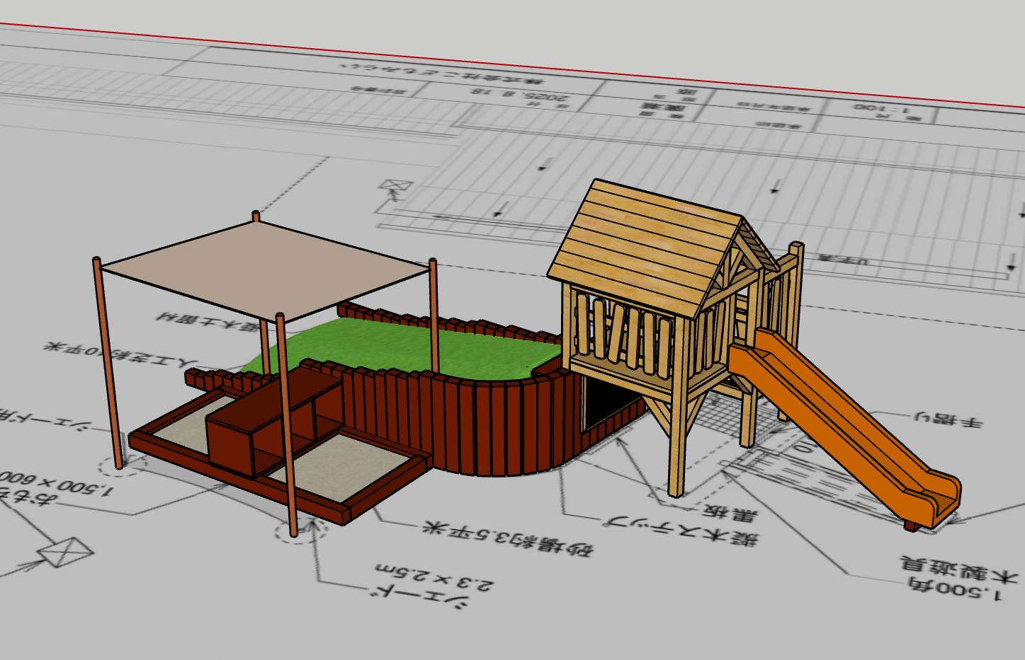 可愛いすべり台遊具に、日よけバッチリの砂場が完成!